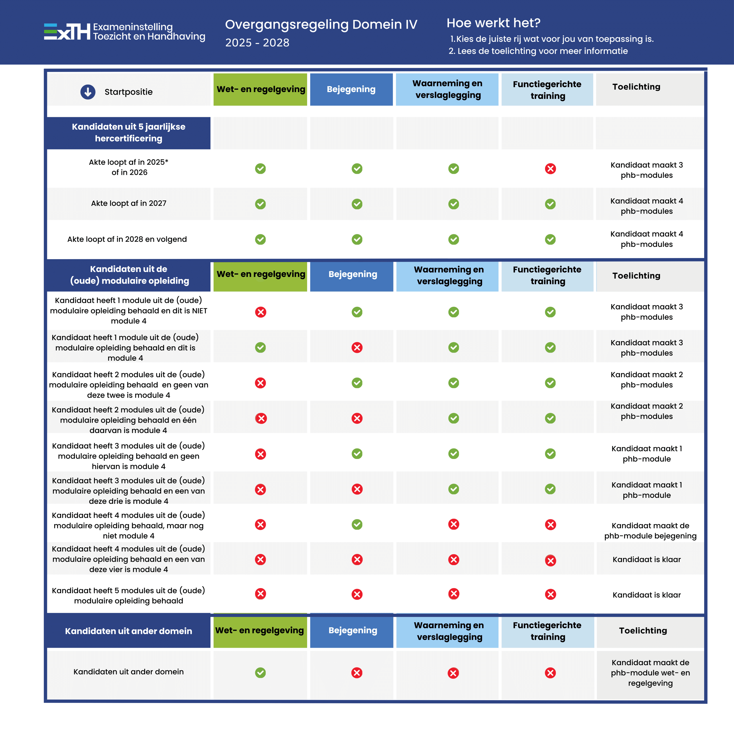 Indien u overstapt uit een ander domein en uw getuigschrift Boa OV wilt halen, moet u altijd de phb-module 1 Wet- en Regelgeving doen.